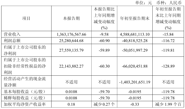 从营收端来看,公司本季度实现营业收入13.63亿元,较上年同期减少9.58%;年初至报告期末,营业收入累计达45.89亿元,同比降幅达15.84%。