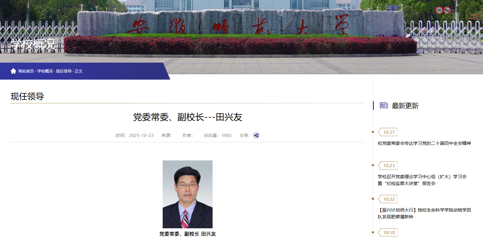 近日,据安徽师范大学网站“现任领导”一栏显示,田兴友已任安徽师范大学党委常委、副校长。