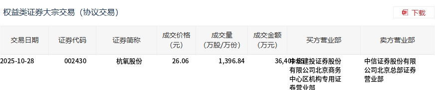 10月28日,杭氧股份大宗交易成交1396.84万股,成交额3.64亿元,占当日总成交额的39.45%,成交价26.06元,较市场收盘价26.14元折价0.31%。
