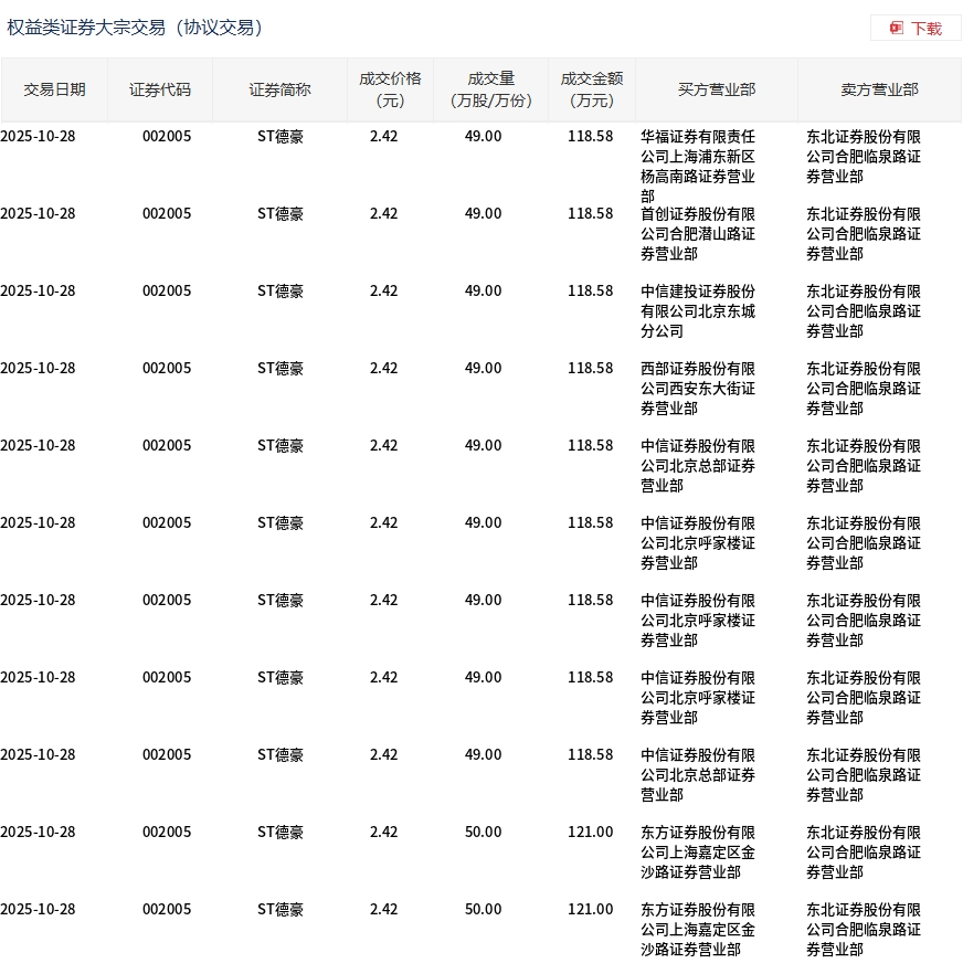 10月28日,ST德豪大宗交易成交541万股,成交额1309.22万元,占当日总成交额的13.71%,成交价2.42元,较市场收盘价2.55元折价5.1%。