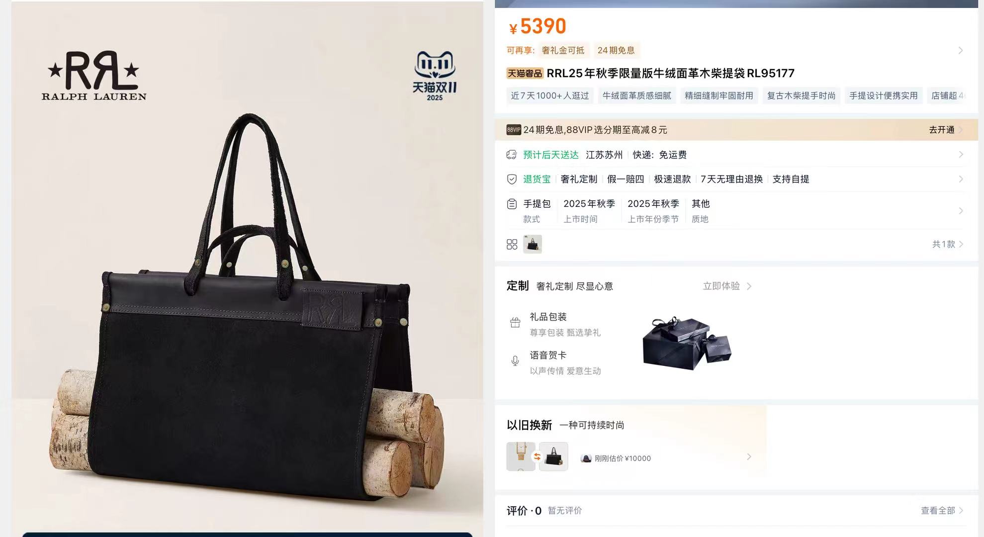 据悉,该产品为拉夫劳伦(Ralph Lauren)2025年秋季新款限量手袋,于9月3日上架销售,售完即止。客服还表示,目前购买此包还可参加双十一的满500减50的优惠。