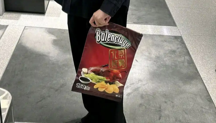 而此前6月,巴黎世家推出的一款“北京烤鸭”包袋,也引发网友吐槽。该包外形与零食袋相似,呈长方形。包身正面印有一只烤鸭图案,还有“Balenciaga”“北京烤鸭”的字样,背面印有“营养成分”表,封口处有细长条拉链。该包外层为牛皮皮质,采用的是意大利顶级皮质,专柜售价15500元。