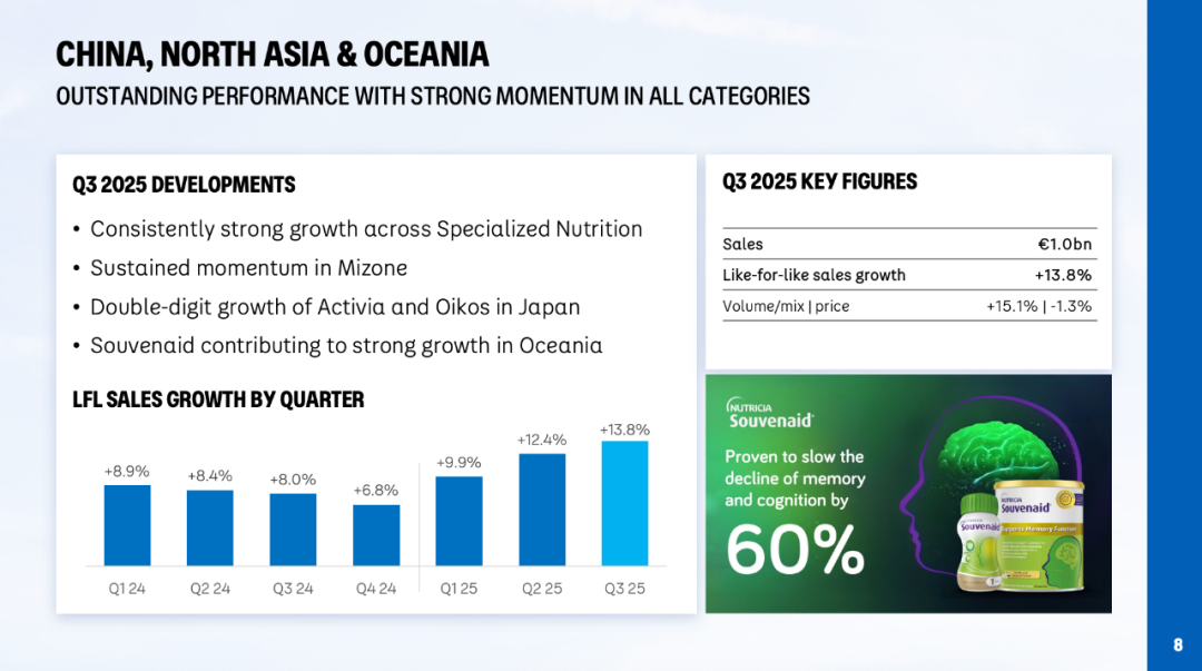 尽管中国市场的奶粉和医学营养品延续了高增长,但Esser今天提醒称,需要对此保持谨慎心态,不要将这股势头简单外推到后续所有季度。“但我们也有充分理由相信,在接下来几个季度,中国业务将创造显著且可持续的增长。”他说。