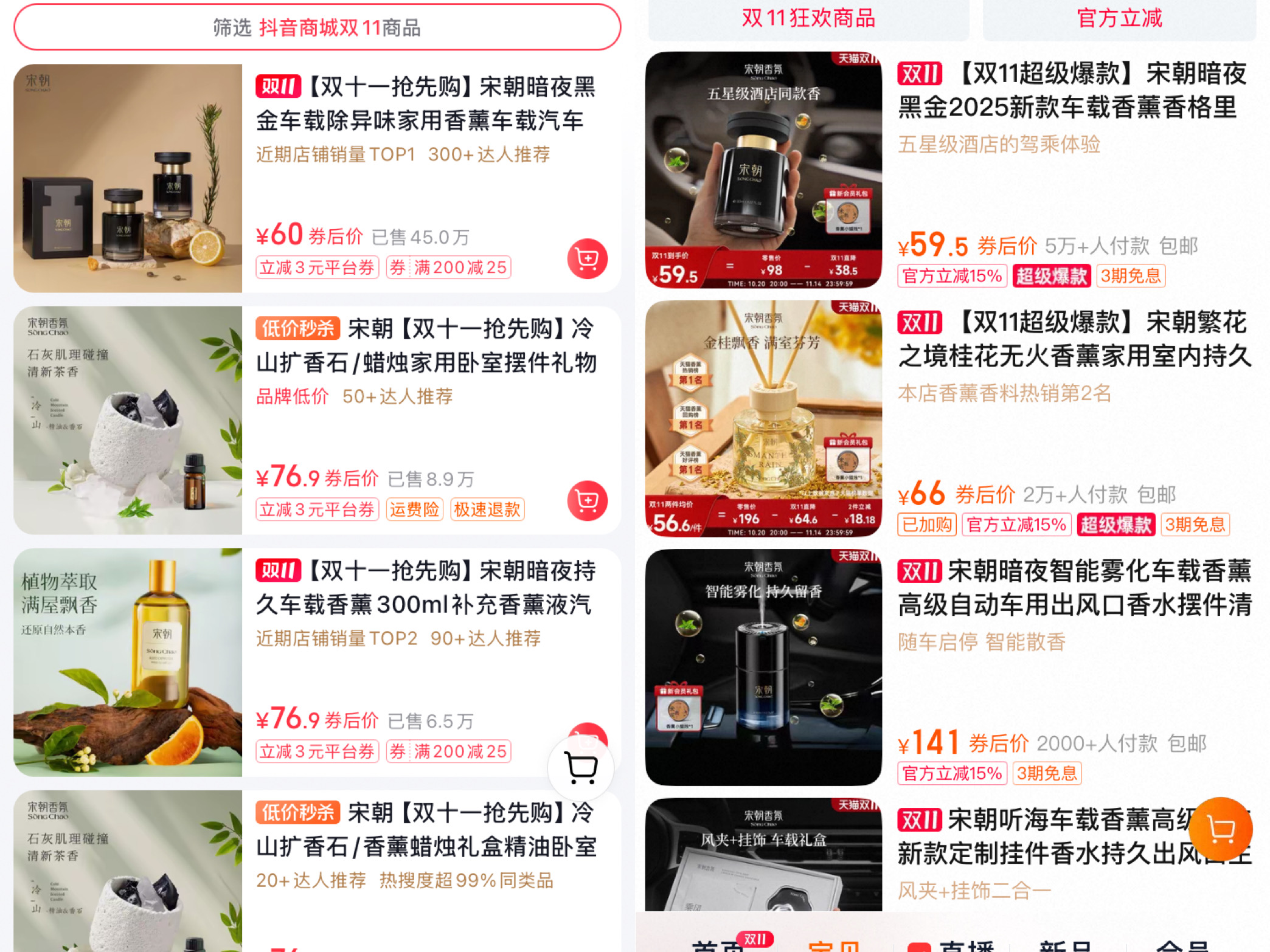 通过“大漠叔叔”的带货,宋朝香氛在抖音俘获了一大批男性车主用户,将99元两瓶的车载香氛“暗夜黑金”打成爆品。蝉妈妈数据显示,2025年至今,由大漠叔叔带货的两个车载香薰商品链接,在宋朝香氛的抖音销售额中占比高达56%。