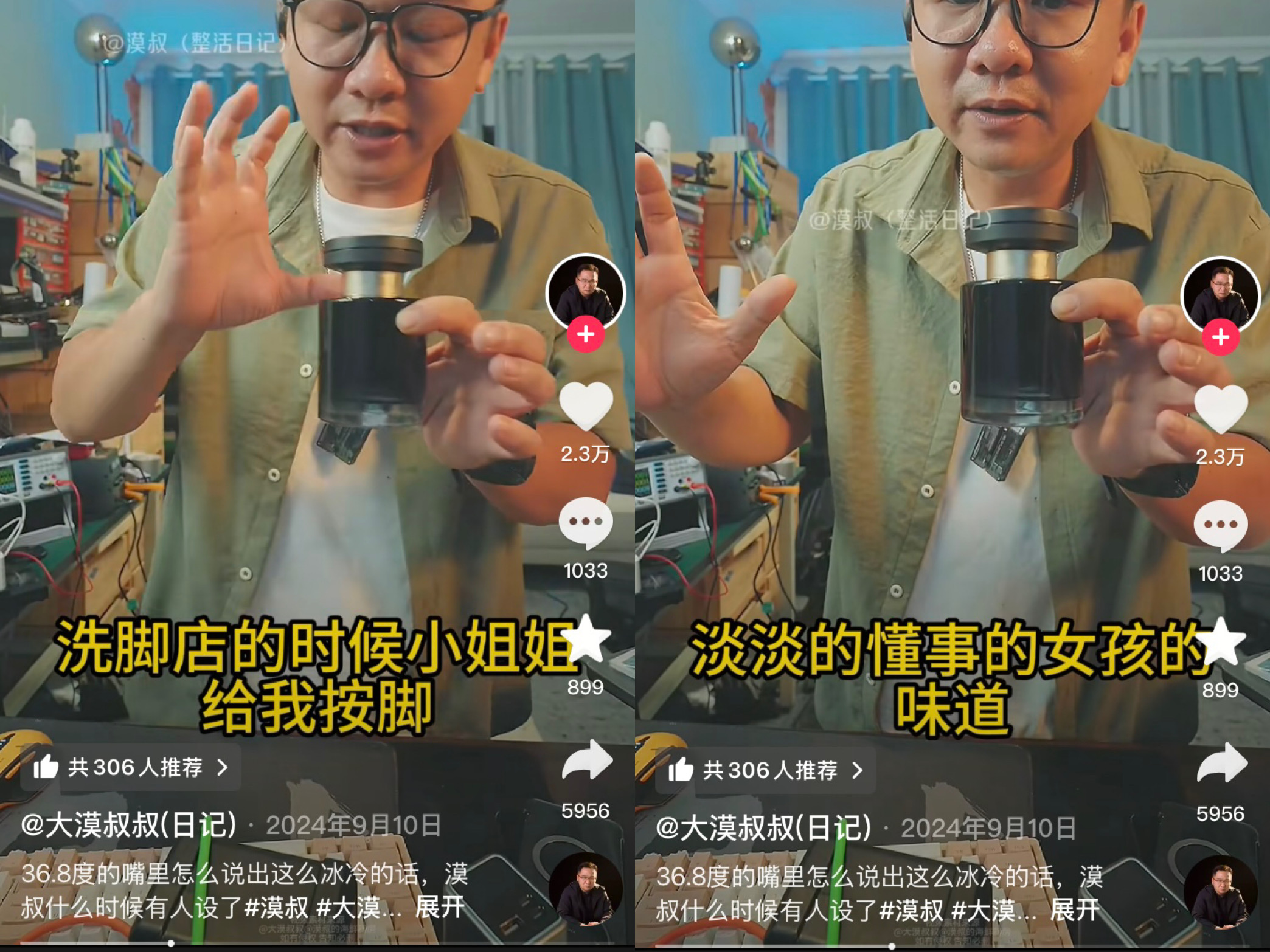 虽然这些命名在宋朝香氛的古风调性里掺入了些许格格不入的现代感,但至少还能给品牌增添一些高级感。而如果去看“大漠叔叔”对该产品的带货话术,会发现其甚至使用了带有性暗示意味的语言。例如,“大漠叔叔”在介绍车载香薰的某款香型时,将其描述为“洗脚店小姐姐身上的味道”,其授权的切片号还使用了“少妇味的香薰”等可能招致争议的文案。