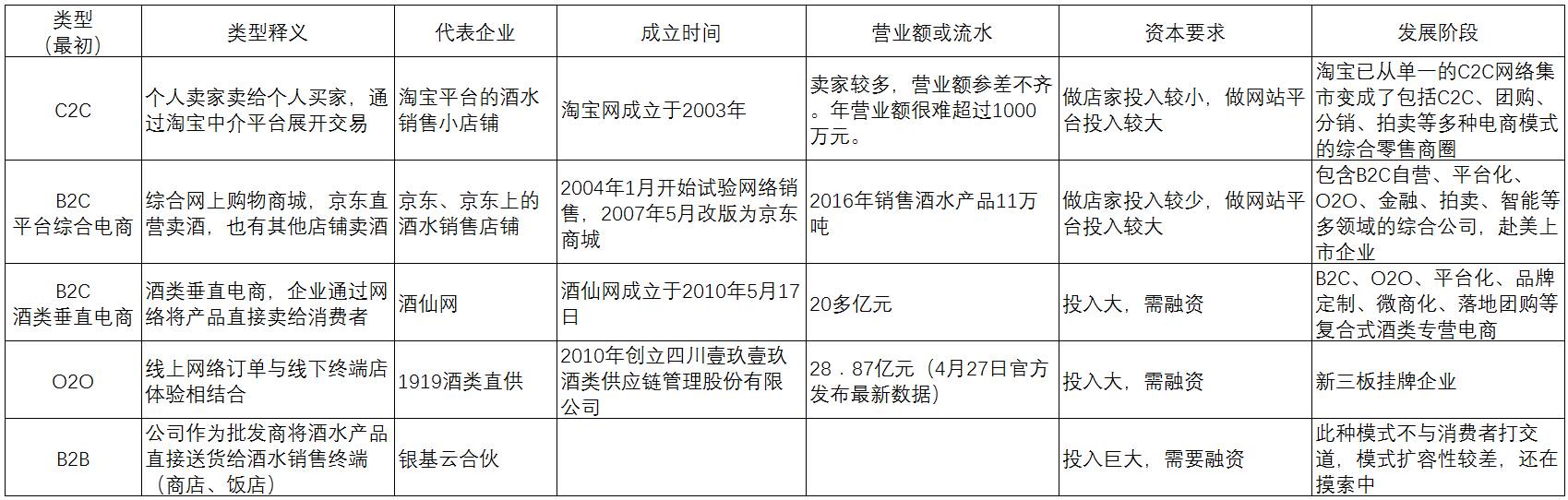 酒水行业电商化发展,已经有些年头。从早期比较单一的网购发展模式,已经逐步成长为复合式的电商生态系统。酒水电商分类和整个电商行业的分类非常吻合,大体可以分为C2C、B2B、B2C、O2O等类型,以及多种形式复合存在的状态。这些英文缩写,很是冰冷,没有体感,看了之后往往令人迷惘乏味。下面一张表格,从酒水电商类型的基本解释、代表企业、代表企业成立时间、创始人出身履历、营业额规模、投资额度状况、目前发展阶段、同类型其它代表企业列举等几个方面做了一个汇总,以便于大家对酒水电商有一个立体而生动的认识。
