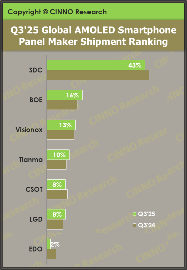 CINNO Research报告指出,随着第三季度传统销售旺季的到来,苹果及国内主流品牌密集发布旗舰新品,显著拉动OLED面板的市场需求。2025年第三季度全球AMOLED智能手机面板出货量约2.5亿片,同比增长11.7%,环比增长20.3%,实现同比与环比双增长,市场景气度持续回升。