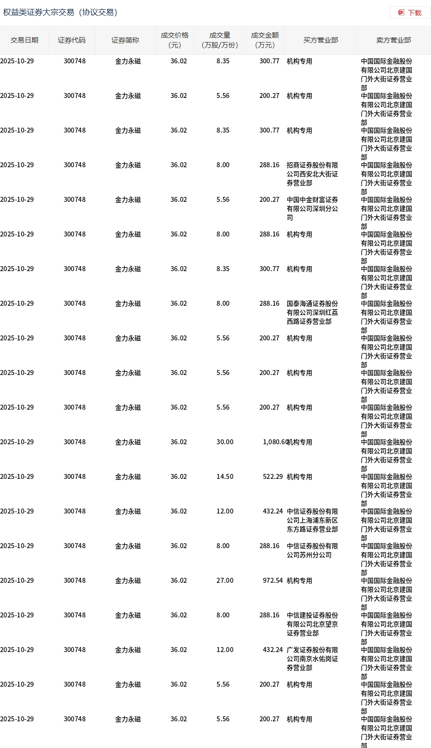 10月29日,金力永磁大宗交易成交298.03万股,成交额1.07亿元,占当日总成交额的4.41%,成交价36.02元,较市场收盘价40.14元折价10.26%。