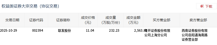 10月29日,联发股份大宗交易成交232.23万股,成交额2563.82万元,占当日总成交额的16.53%,成交价11.04元,较市场收盘价11.63元折价5.07%。