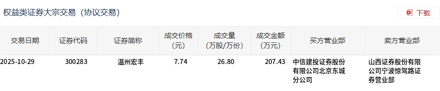 10月29日,温州宏丰大宗交易成交26.8万股,成交额207.43万元,占当日总成交额的0.28%,成交价7.74元,较市场收盘价7.9元折价2.03%。