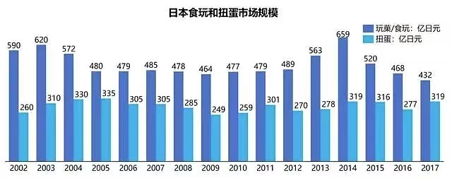 据日本玩具协会统计数据,2017年,日本食玩市场规模432亿日元。虽然自2018年起日本玩具协会不再统计单独的食玩市场规模,但根据万代公开报告中引用的富士经济株式会社数据,2022年日本食玩市场已达501亿日元,同比增长9.39%。
