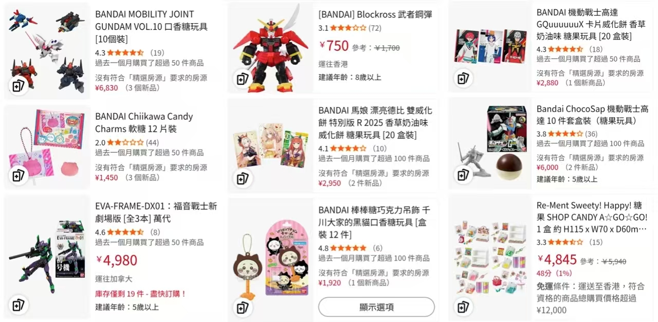 比如,在亚马逊购物平台中检索“食玩”这一关键词,首先检索到的就是IP食玩商品,数量还不少,涉及到《机动战士高达》、三丽鸥、Chiikawa、《新世纪福音战士》等热门IP。