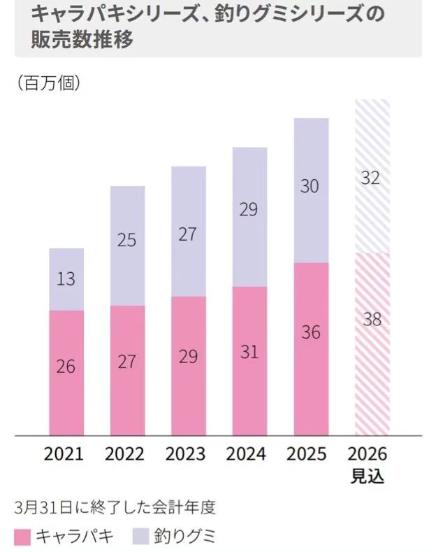 菓子业务,聚焦“无赠品”模式,以菓子本身为娱乐载体,主打儿童市场,通过“趣味性”与“造型感”打造出“キャラパキ”、“釣りグミ”、“チョコパーキング”等热门品牌,其中“キャラパキ”系列仅日本国内年销量就达3600万件,“釣りグミ”系列年销量也达3000万件,仅用5年时间便实现了显著增长。