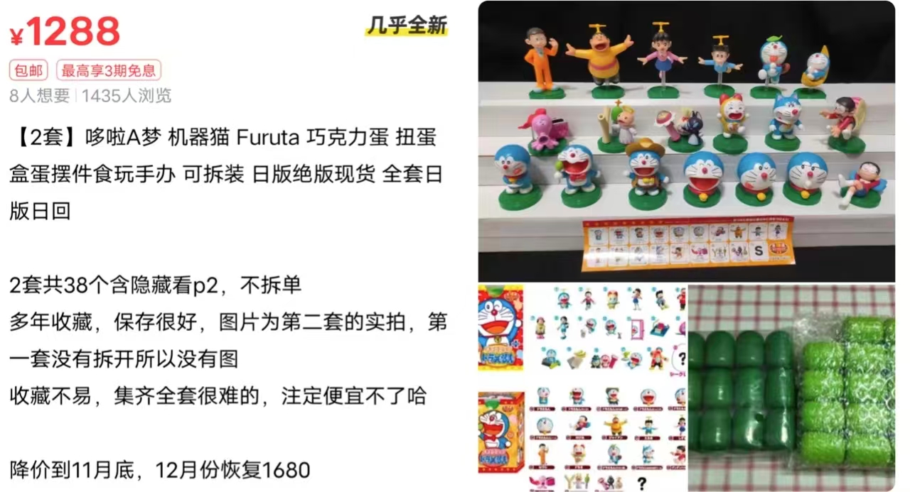 时隔七年,这套食玩摆件在国内仍拥有爱好者,两套全套摆件在国内的二手平台上被炒至上千元,却仍有8人持有购买意向。
