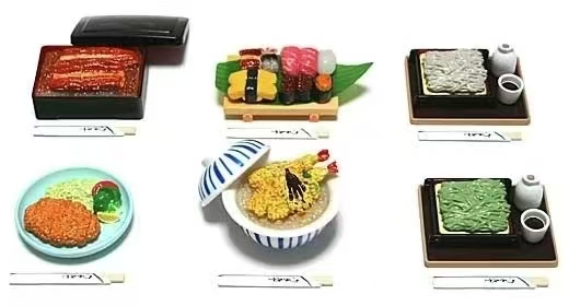 Re-ment于2002年发售经典的“小小样品”系列微缩模型第一弹“和食处”,以日本传统和食为主题,通过高度逼真的微缩模型,将各种和食菜品及相关餐具等细致呈现。从寿司、荞麦面到天妇罗、鳗鱼饭等,每一款食物都在细节上做到了极致还原,比如寿司的鱼片纹理、天妇罗的酥脆感等都刻画得栩栩如生,同时还搭配了相应的小道具,如酱油瓶、筷子、餐盘等,整套食玩都充斥着浓郁的日本和食文化氛围。