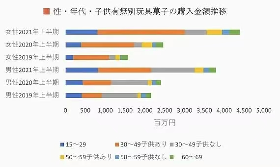 食玩本身的强趣味性和高操作性,让食玩不仅被小孩接受,许多成年人也相当喜爱。近年来,日本食玩市场30-49岁的有娃人群,15-29岁的年轻群体比例快速爬升,消费金额也逐年上涨,这两部分群体已经成为拉动日本食玩市场的消费主力。