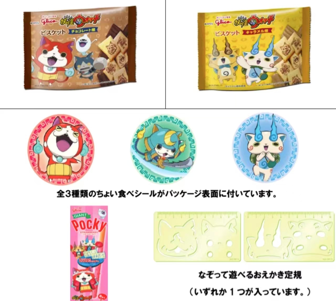 2014年底,品牌首次与现象级IP《妖怪手表》合作,在联名巧克力中附赠时间表贴纸,凭借IP热度迅速打开市场。2015年6月,双方乘势推出第二弹联动,合作规模进一步升级,覆盖便携薯条、巧克力棒、冰淇淋等30款商品,其中多款食玩延续“食品+实用好物”的模式,如“巧克力棒+尺子”“糖果+挂坠”“饼干+徽章”,既保留了零食的美味,又让玩具兼具使用价值,成为当时亲子群体中的热门选择。