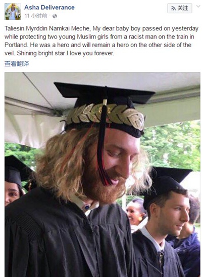 为保护遭辱骂的穆斯林女孩,两名男子在美国俄勒冈州波特兰市的一辆火车上被持刀的袭击者刺死,另有一人受伤。死者分别为一名退伍军人和一名大学毕业生。