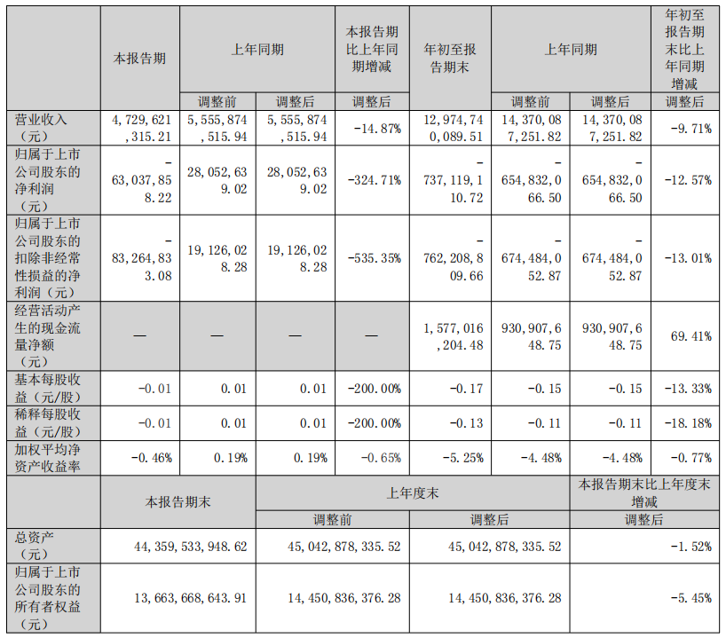 在营收方面,本报告期(单三季度)公司实现营业收入55.56亿元,较上年同期的63.04亿元同比下降12.57%;年初至报告期末,累计营业收入129.75亿元,较上年同期的143.70亿元同比减少9.71%。