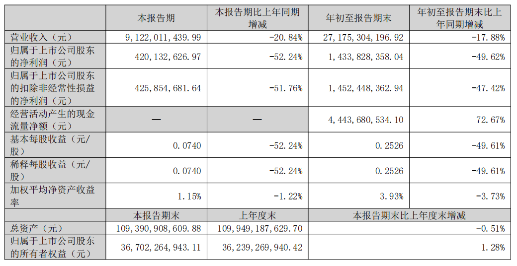 截至三季度末,公司总资产1093.91亿元,较上年末基本持平;归属于上市公司股东的所有者权益 367.02亿元,资产负债率维持在合理区间。