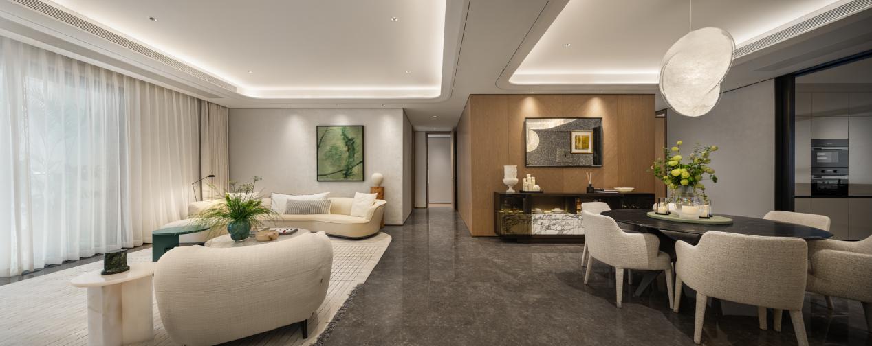 高效空间效率:约80%的高得房率,在寸土寸金的滨江区域实现了空间效能最大化。通过精密的平面规划,实现“5+1房”灵活布局与南北通透的“飞机户型”设计。设计师以“空间流动性”为核心理念,三间套房均朝南布置,极大提升了采光与通风效率。约50㎡的LDKB一体化公区串联客餐厨阳台,形成完整家庭社交核心;约9.3米超大横厅可根据生活需求灵活改造,既可作为亲子活动区,也可拓展为家庭影院或开放式书房,实现空间功能的高度复合与高效利用。