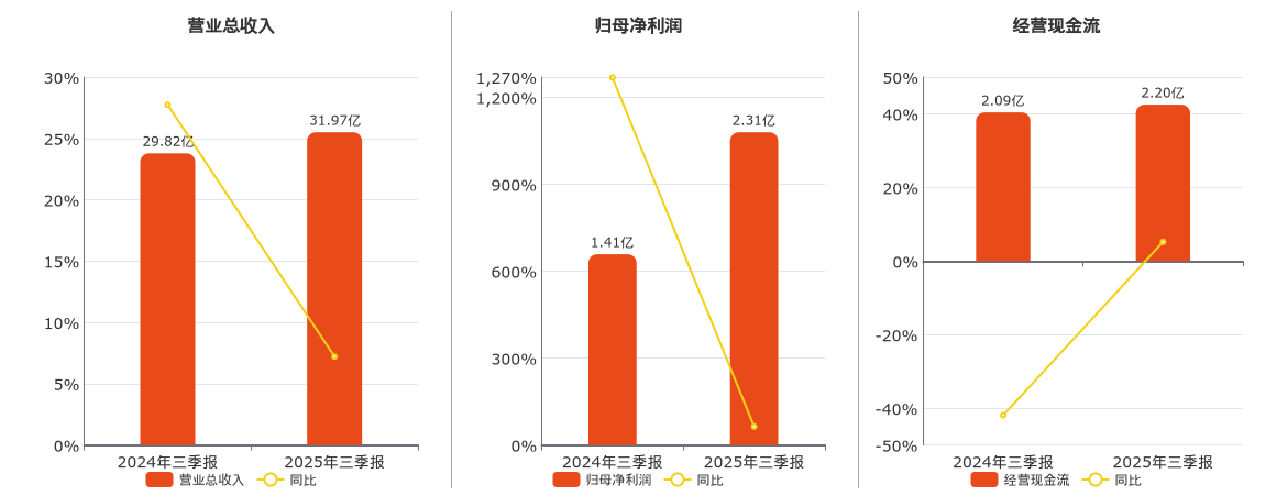 公司营业总收入为31.97亿元。归母净利润为2.31亿元。经营活动现金净流入为2.20亿元。
