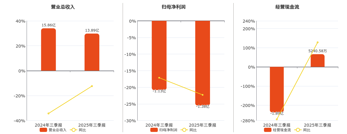 公司营业总收入为13.89亿元,在已披露的同业公司中排名第56,较去年同报告期营业总收入减少1.97亿元,同比较去年同期下降12.41%。归母净利润为-1.38亿元,在已披露的同业公司中排名第78,较去年同报告期归母净利润减少2508.51万元。经营活动现金净流入为5240.58万元,在已披露的同业公司中排名第53,较去年同报告期经营活动现金净流入增加2.41亿元。