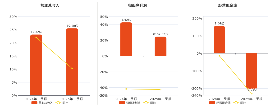 公司营业总收入为19.10亿元,在已披露的同业公司中排名第37,较去年同报告期营业总收入增加1.77亿元,实现2年连续上涨,同比较去年同期上涨10.23%。归母净利润为8152.52万元,在已披露的同业公司中排名第41,较去年同报告期归母净利润减少6072.84万元,同比较去年同期下降42.69%。经营活动现金净流入为-2.01亿元,在已披露的同业公司中排名第78,较去年同报告期经营活动现金净流入减少3.56亿元,同比较去年同期下降230.53%。