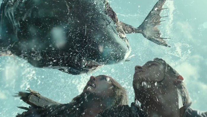 杰克船长挂在船舷外和幽灵船长萨拉查搏斗时,沉默玛丽号的船首像突然活了过来,扭动着巨大的身躯一边恐吓一边加入战斗,让我等巨物恐惧症患者又惊又怕。