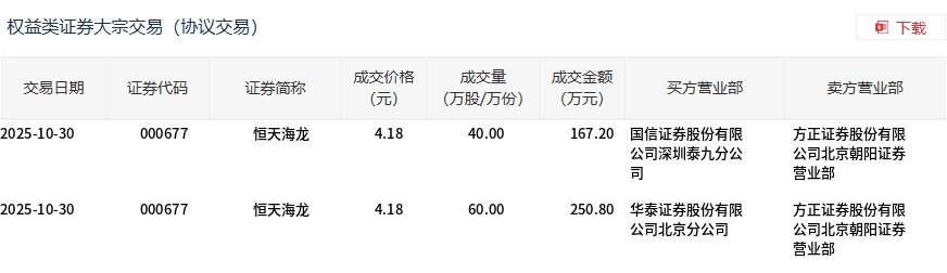 10月30日,恒天海龙大宗交易成交100万股,成交额418万元,占当日总成交额的5.27%,成交价4.18元,较市场收盘价4.54元折价7.93%。