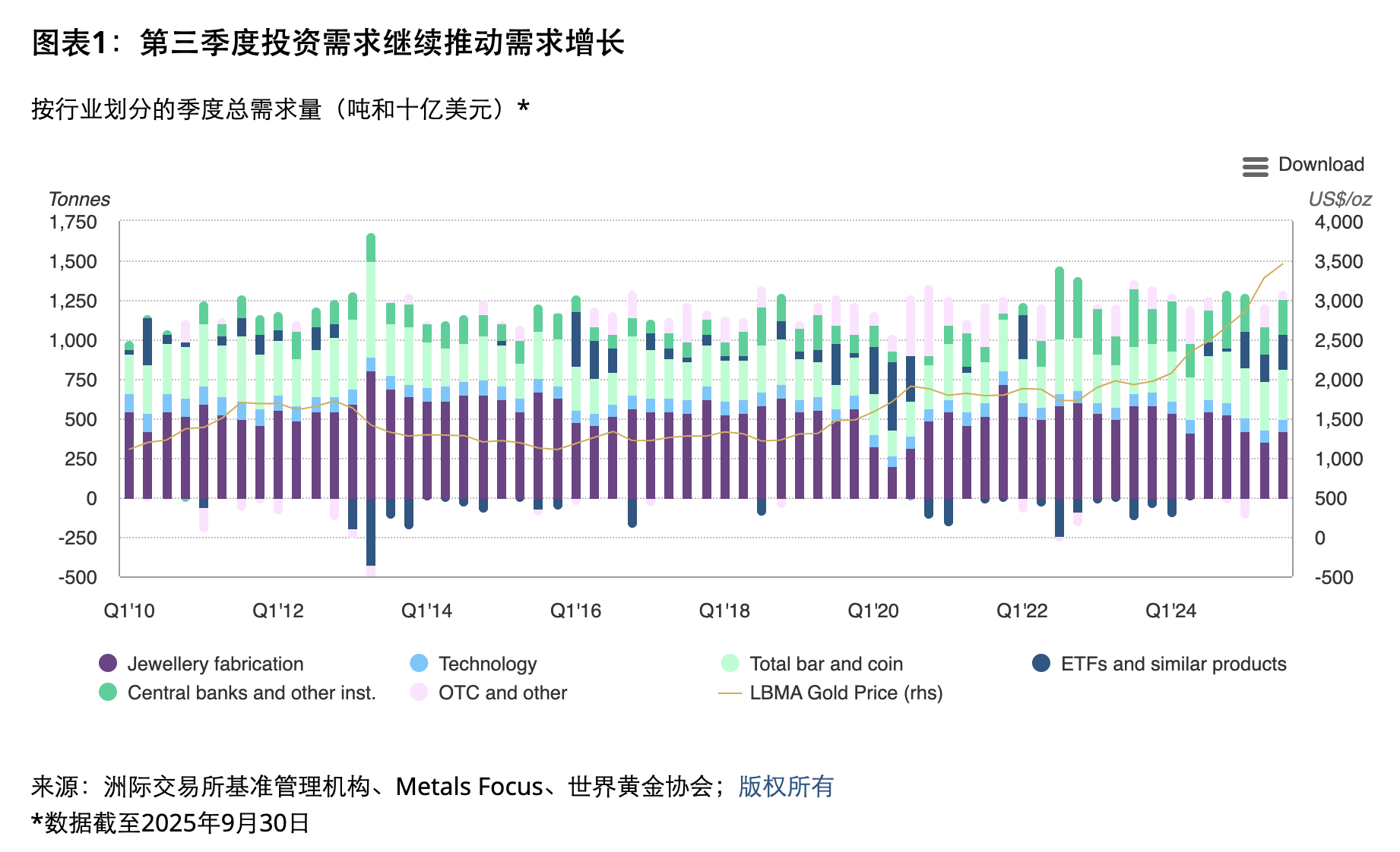10月30日,世界黄金协会发布的2025年三季度《全球黄金需求趋势报告》(下称《报告》)给出了上述数据。