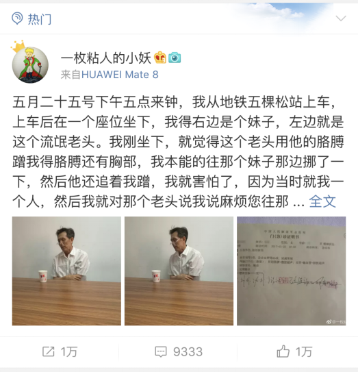 “我刚坐下,就觉得他的胳膊蹭我的胳膊还有胸部,我本能的往旁边挪了一下,然后他还追着我蹭,我就害怕了,因为当时就我一个人,然后我就对那个老头说我说麻烦您往那边挪挪,我别碰着您。结果他说你xx的小东西让谁挪,我说您别骂人呢。然后他就冲着我头打我,一大巴掌糊我脸。”当事人杨小姐对未来网记者说。