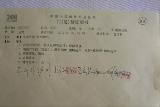 当天晚上,杨小姐在北京301医院检查,诊断为尿浅血以及身上有顿挫伤。