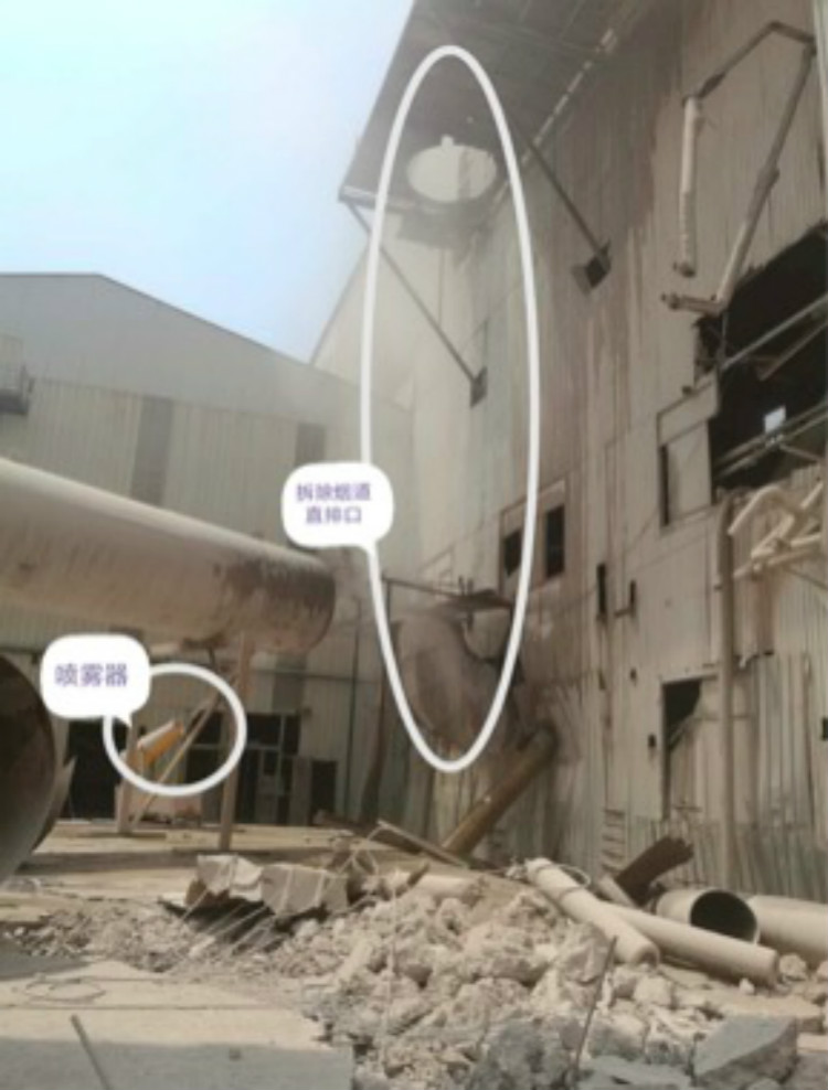 检查发现,该企业将其中一个干燥塔烟道拆除,改为近地面直接排放,采用喷雾方式降低粉尘,但厂区内仍然污染严重。