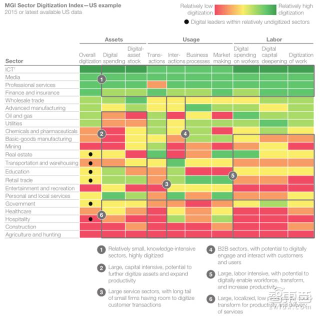 不同领域的数字化程度有所差异,在美国,信息与通信技术行业、媒体、金融服务和专业人士服务业的数字化正在迅猛发展,而公用事业,矿业,和制造业等,都还处在早期数字化阶段。零售和医疗等大规模劳动力密集型领域广泛不采用该技术。