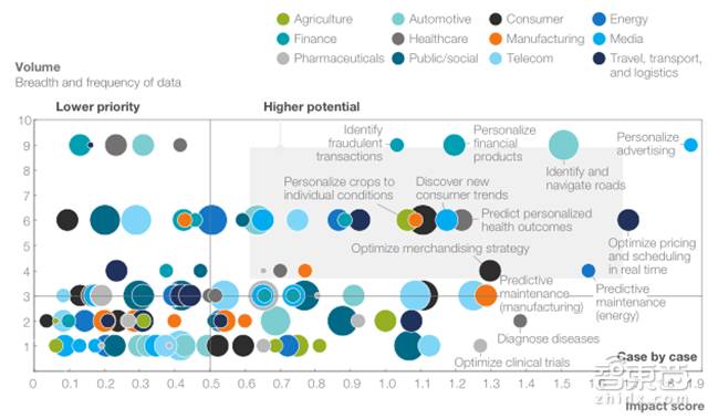 *机器学习在各个行业中的应用潜力(色块代表不同行业)