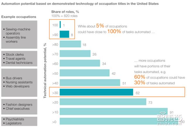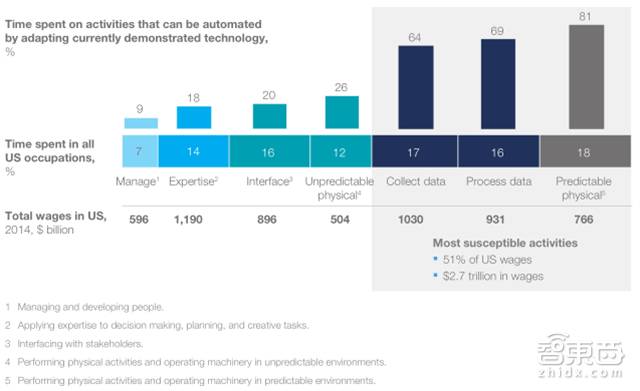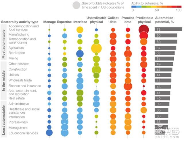 自动化的未来许诺了生产力水平的提高,但给劳动力市场带来隐忧。自动化活动更容易覆盖的是食品服务、制造业、交通运输、仓储和零售贸易这类具有高度可预测性和结构化物理活动环境的工作。