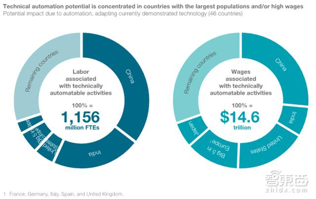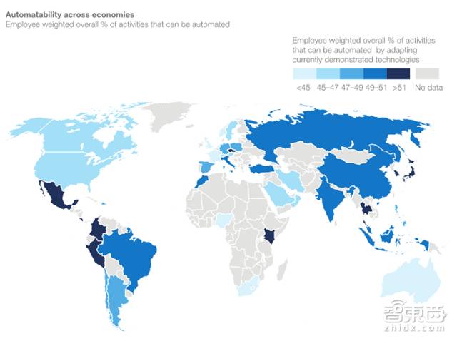 调研显示,全球劳动力市场的80%集中在46个国家,也就是几乎一半的人都能在全球经济中获得酬劳,其中60%的工作或者说职业是可以转化为自动化的。中国、印度、日本、和美国四大经济体也逐渐在实现自动化技术转换,工人的技能也在发展,美国工人在有自动化帮助的前提下,工资依旧是其他国家的两到三倍。