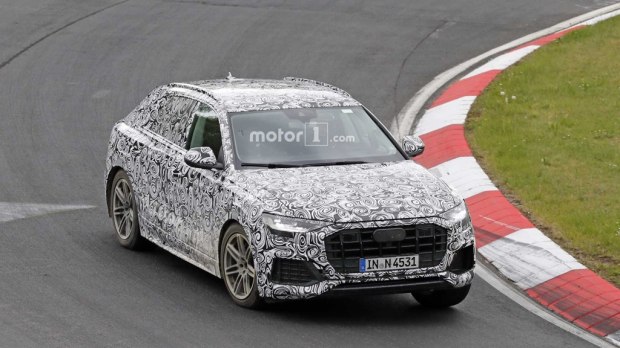 测试版奥迪Q8的前脸设计与概念车的样式基本保持一致,细长的前大灯组造型十分犀利,其内部疑似加入了LED光源,尺寸夸张的八边形前进气格栅与下方多边形的网状进气口交相呼应。车身侧面采用了溜背式设计,营造出极强的运动感。