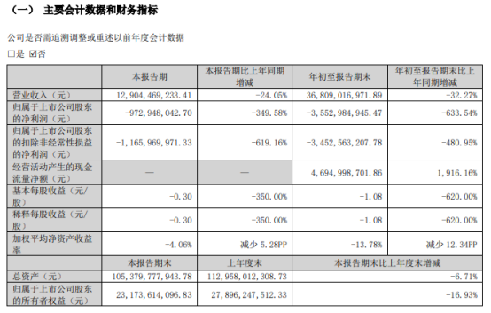 其中,第三季度,公司营业收入为129.0亿元,同比下降24.1%;归母净利润亏损9.73亿元,同比下降349.6%;扣非归母净利润亏损11.7亿元,同比下降619.2%。
