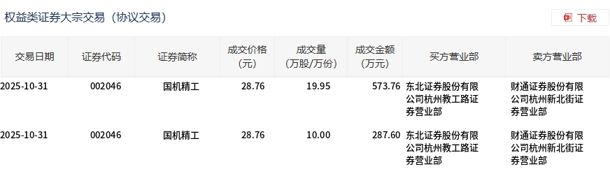 10月31日,国机精工大宗交易成交29.95万股,成交额861.36万元,占当日总成交额的2.16%,成交价28.76元,较市场收盘价28.63元溢价0.45%。