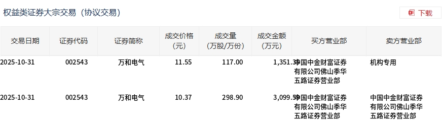 10月31日,万和电气大宗交易成交415.9万股,成交额4450.94万元,占当日总成交额的47.45%,成交均价10.7元,较市场收盘价11.55元折价7.34%,其中最高成交价11.55元,最低成交价10.37元。