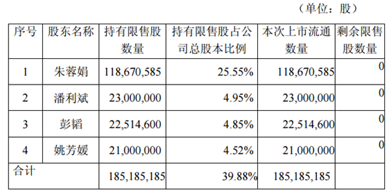 本周解禁股份总股本比例最高的是国发股份。公司5月31日将有1.85亿股限售股上市流通,占比39.88%,解禁市值12.5亿元。解禁股东为4位自然人,分别是朱蓉娟、潘利斌、彭韬和姚芳媛。其中控股股东朱蓉娟、彭韬夫妻二人解禁比例超过30%,占此次解禁总量的近八成;法人代表和总经理潘利斌也持有4.95%比例股份。