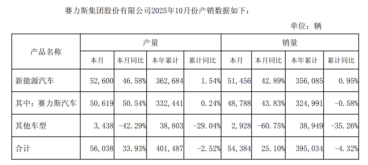 赛力斯11月2日公告,2025年10月份公司新能源汽车销量为51,456辆,同比增长42.89%;产量为52,600辆,同比增长46.58%。2025年1-10月,公司累计销售新能源汽车356,085辆,同比增长0.95%;累计产量为362,684辆,同比增长1.54%。