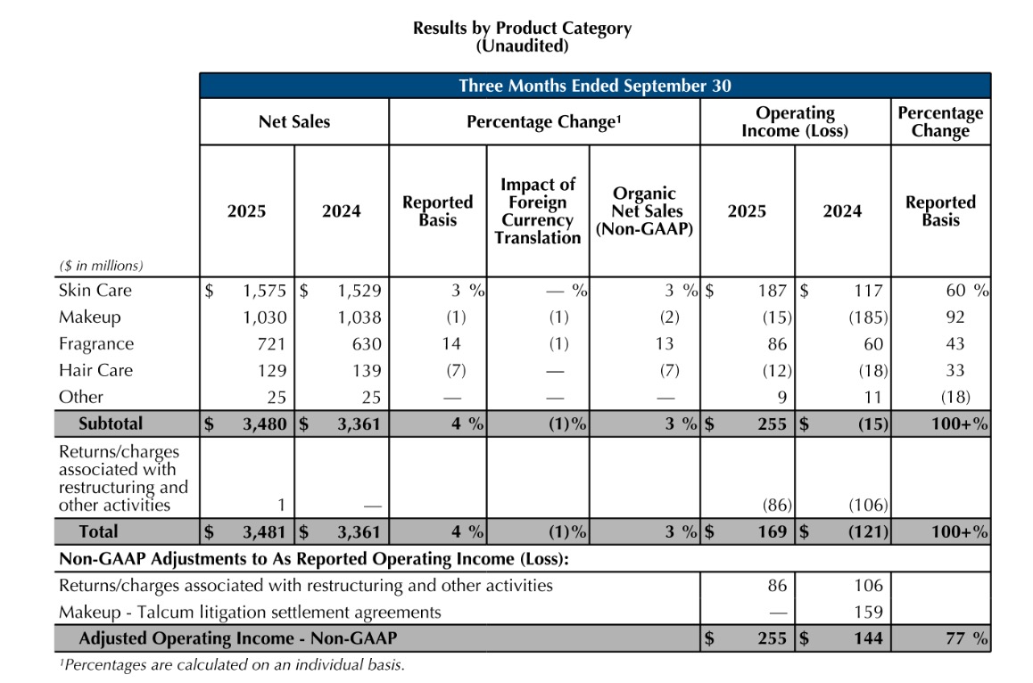 护肤品类实现3%有机增长,海蓝之谜与雅诗兰黛两大核心品牌受益于亚洲旅游零售复苏与新品驱动——前者推出“赋活肌肤生命力”品牌平台并深化科研合作,后者的特润修护眼霜与白金级精萃水抢占高端抗老市场。彩妆品类虽有机销售仍下滑2%,但运营端已从上年滑石粉诉讼的1.59亿美元(约合人民币11.31亿元)费用拖累中恢复,亏损幅度收窄92%。护发品类则因艾凡达(Aveda)品牌战略调整出现7%下滑。