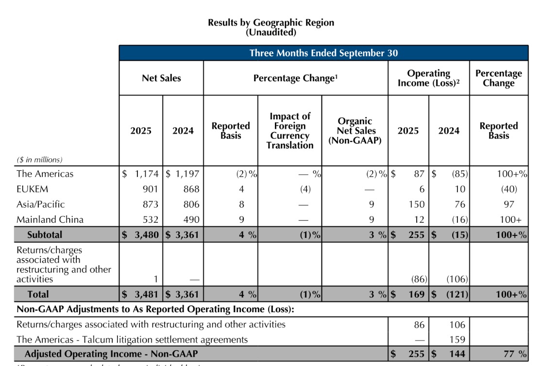 报告期内,集团净销售额达34.81亿美元(约合人民币247.63亿元),同比增长4%;扣除重组退货、收购剥离及汇率影响后的有机净销售额为34.55亿美元(约合人民币245.79亿元),同比增长3%;营业利润1.69亿美元(约合人民币11.92亿元),同比激增超100%。多项核心指标印证“重塑美妆新境”战略初显成效。