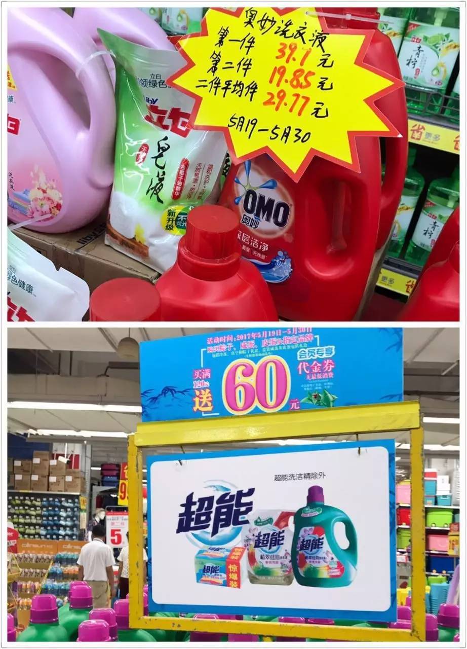 上述家乐福洪山店的导购员解释,由于商超系统不同,所以不一定会同时做活动。而就她的观察,平时蓝月亮也很少做活动,相比其货架上的“邻居”超能来说,蓝月亮做活动的频率就更低了。