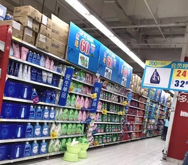 与家乐福店内情况截然不同的是,在武汉市武商广埠屯店以及沃尔玛徐东店等其他商超系统内,蓝月亮与立白、超能等品牌的排面均相当。