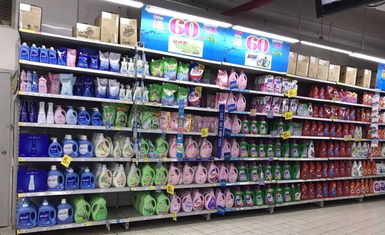 同样,在家乐福钟家村店内的七个洗衣液货架中,蓝月亮也只占据了一个货架的面积,而立白、超能、奥妙三个品牌的产品加起来就占据了洗衣液排面的七分之四。