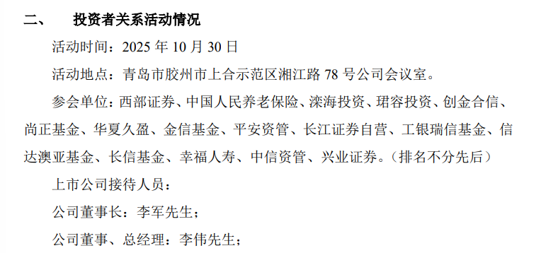 10月31日,青岛丰光精密机械股份有限公司(代码:920510;简称:丰光精密)发布了最新一期的投资者关系活动记录表。10月30日,丰光精密在公司会议室举行特定对象调研与线上会议,参会单位包括西部证券、中国人民养老保险、滦海投资等机构,接待人员包括公司董事长李军、公司董事兼总经理李伟、公司董事兼财务总监王学良,以及公司董事会秘书杨雪。